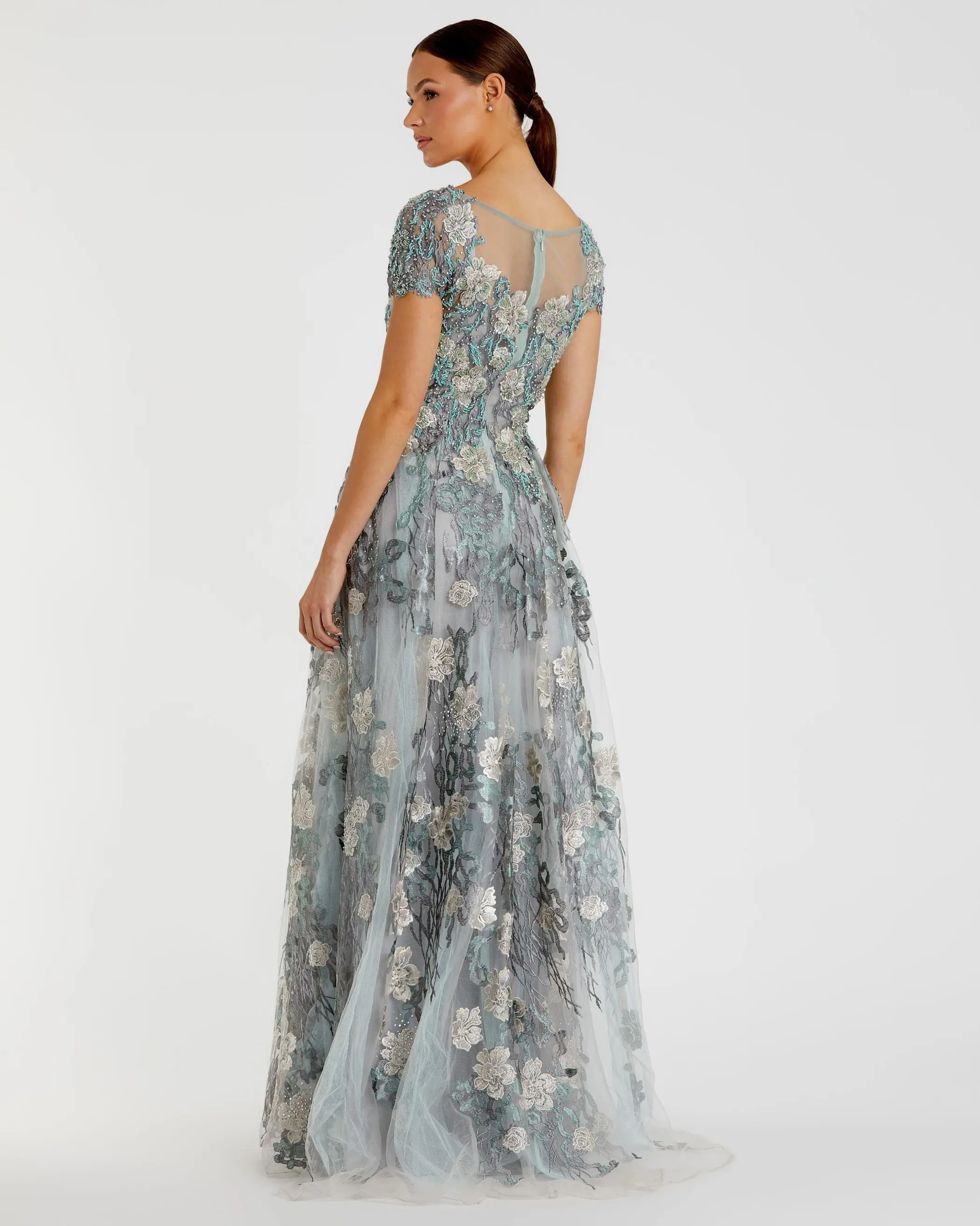 Floral embroidered evening gown with an illusion v-neckline with rhinestone accents. A floor length sweeping train completes this look.