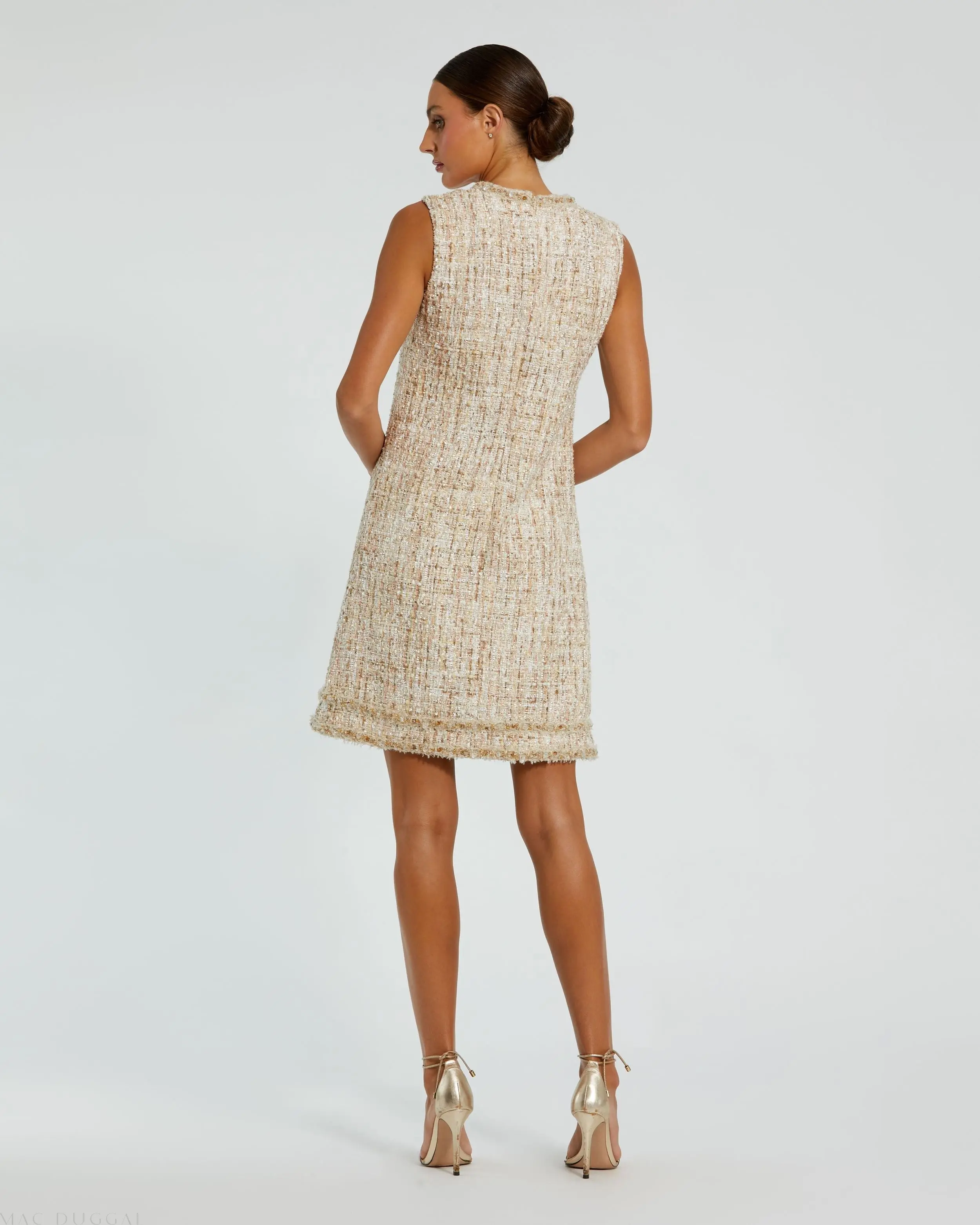 Elevate your style with our Beaded Trim A-Line Mini Shift Dress. This chic sleeveless boucle dress features subtle beaded detailing, a flattering A-line silhouette, and a modern shift design, offering both comfort and sophistication.
