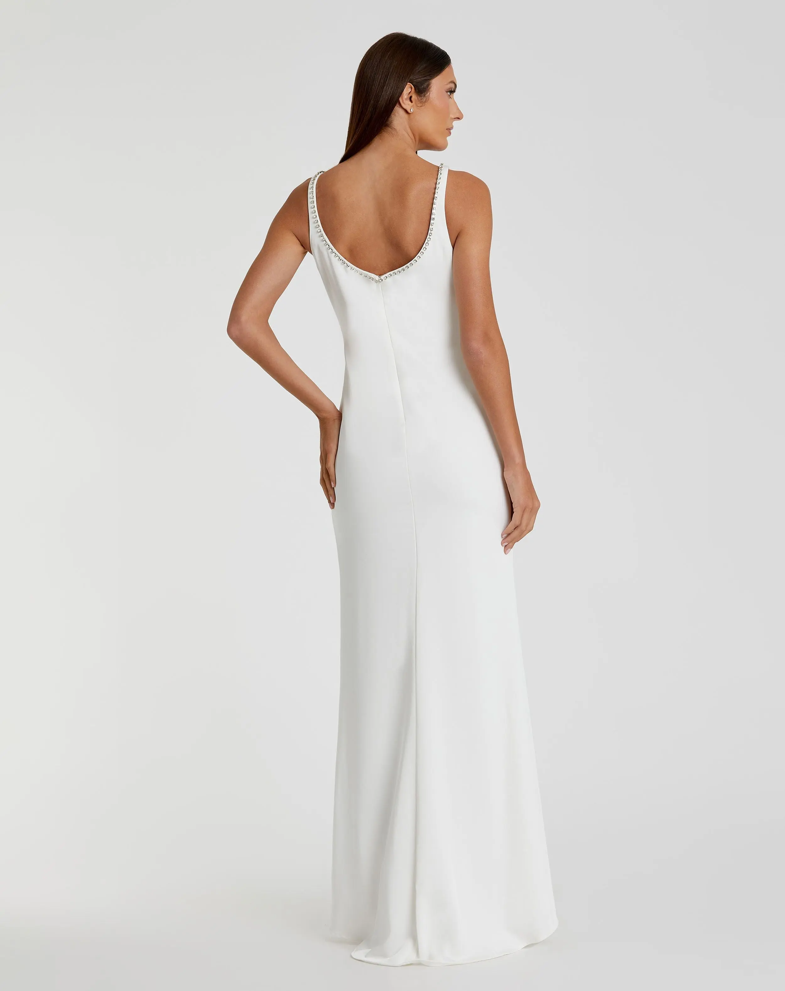 White Sleeveless Crystal Scoop Neckline Column Gown with High Slit