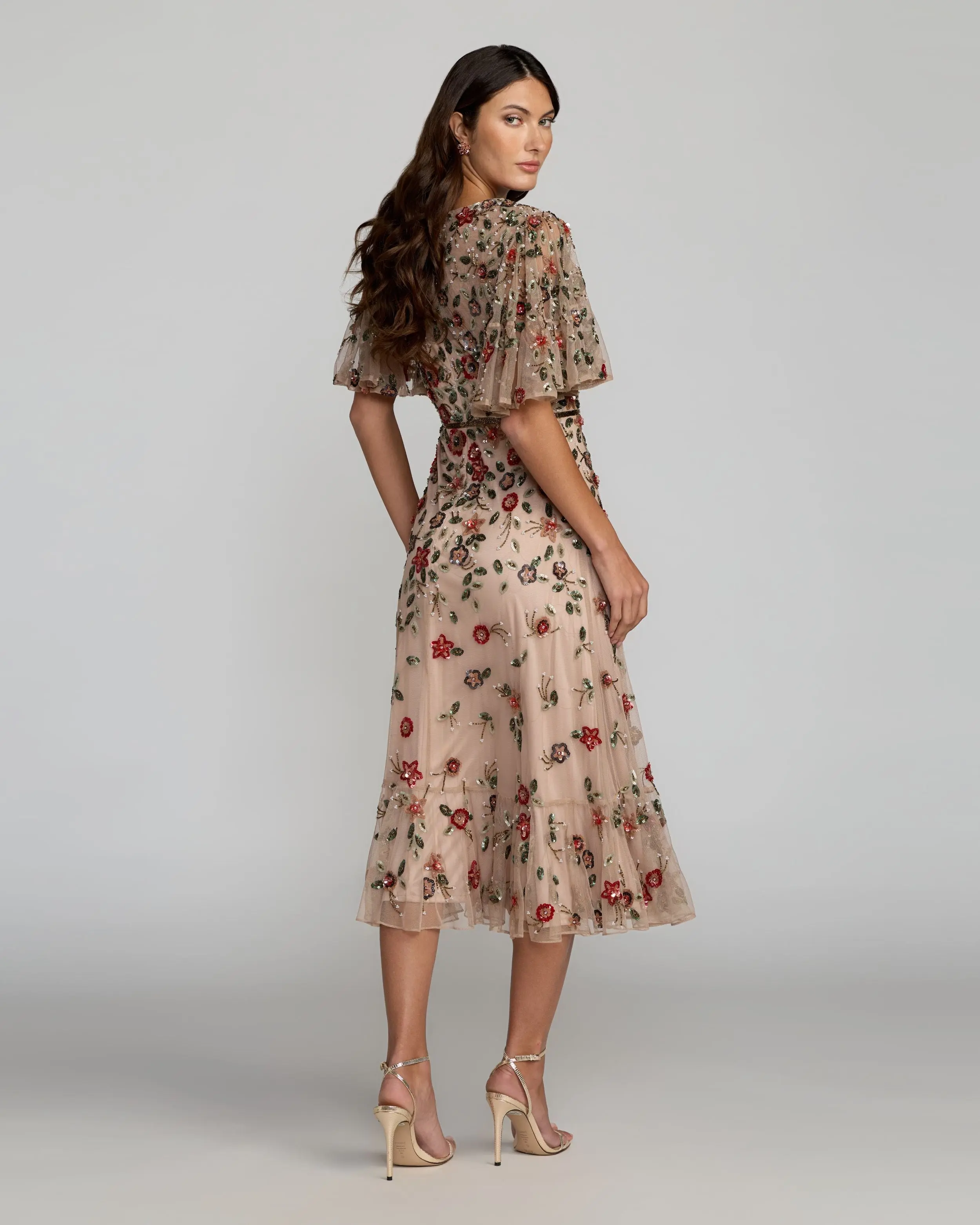 Embrace vintage-inspired glamour in this stunning hand-embellished midi dress. Sheer flutter sleeves, glimmering floral embellishments, and a soft ruffle hem make it the perfect dress for cocktail parties, weddings, or any event that calls for effortless elegance.