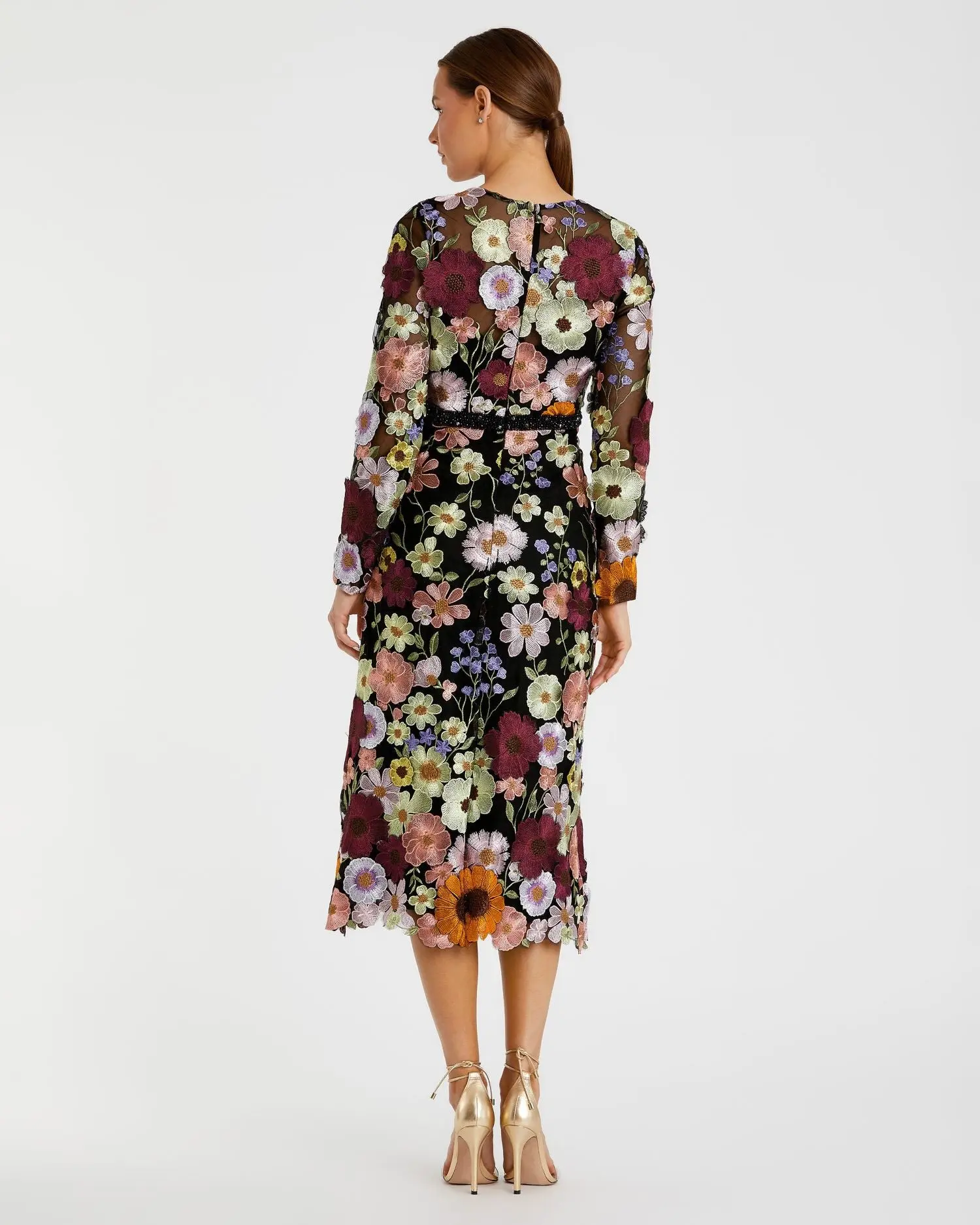 This multicolor A-line midi dress is adorned with vibrant floral embroidery and hand-stitched appliqué, creating a timeless silhouette perfect for day and evening events.