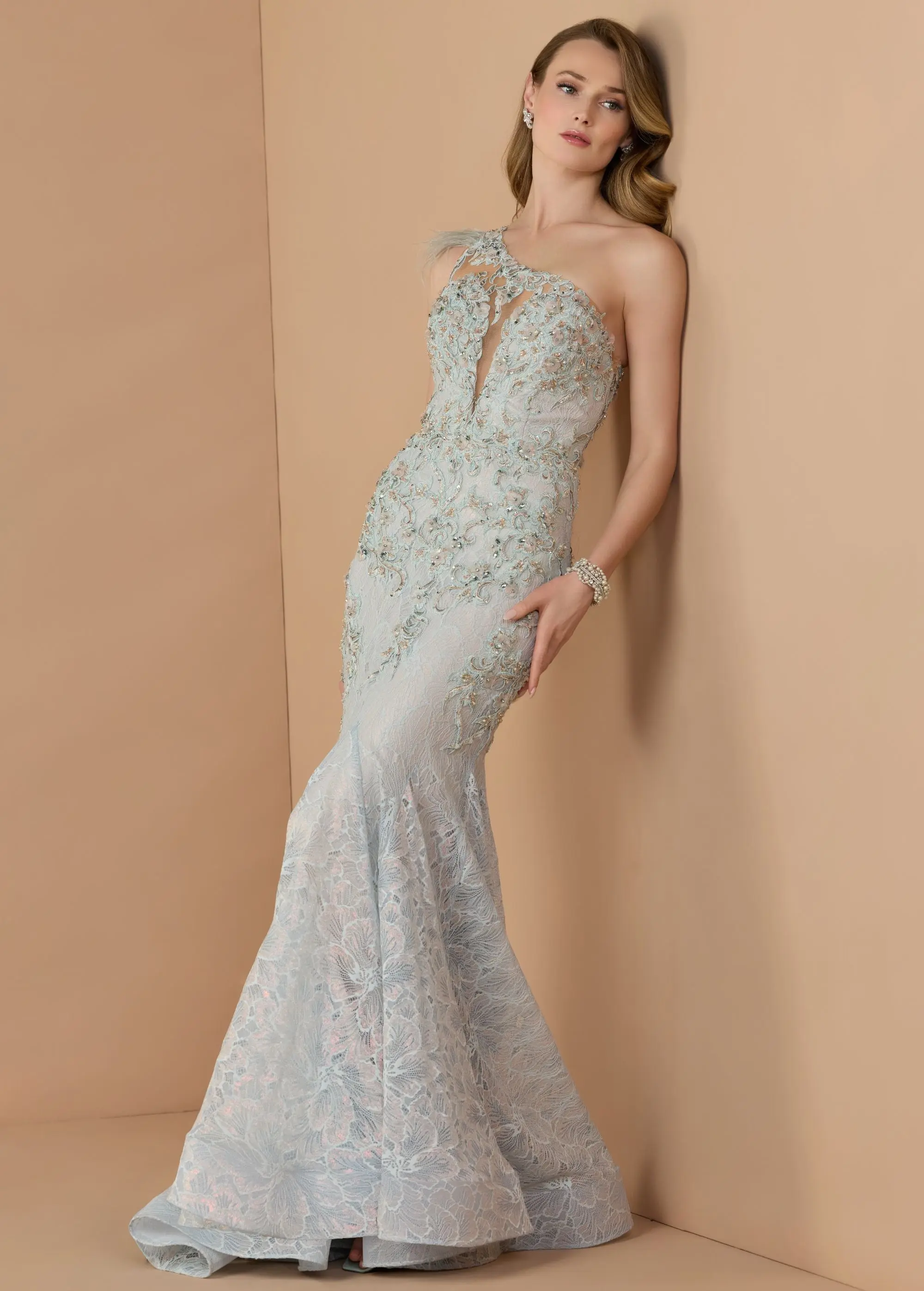 This embroidered lace gown blends timeless elegance with modern detail. The illusion plunge neckline and feather trimmed shoulder add subtle drama, while the sculpted mermaid silhouette and flared lace hem create a graceful, feminine finish. Ideal for black tie affairs and formal celebrations.