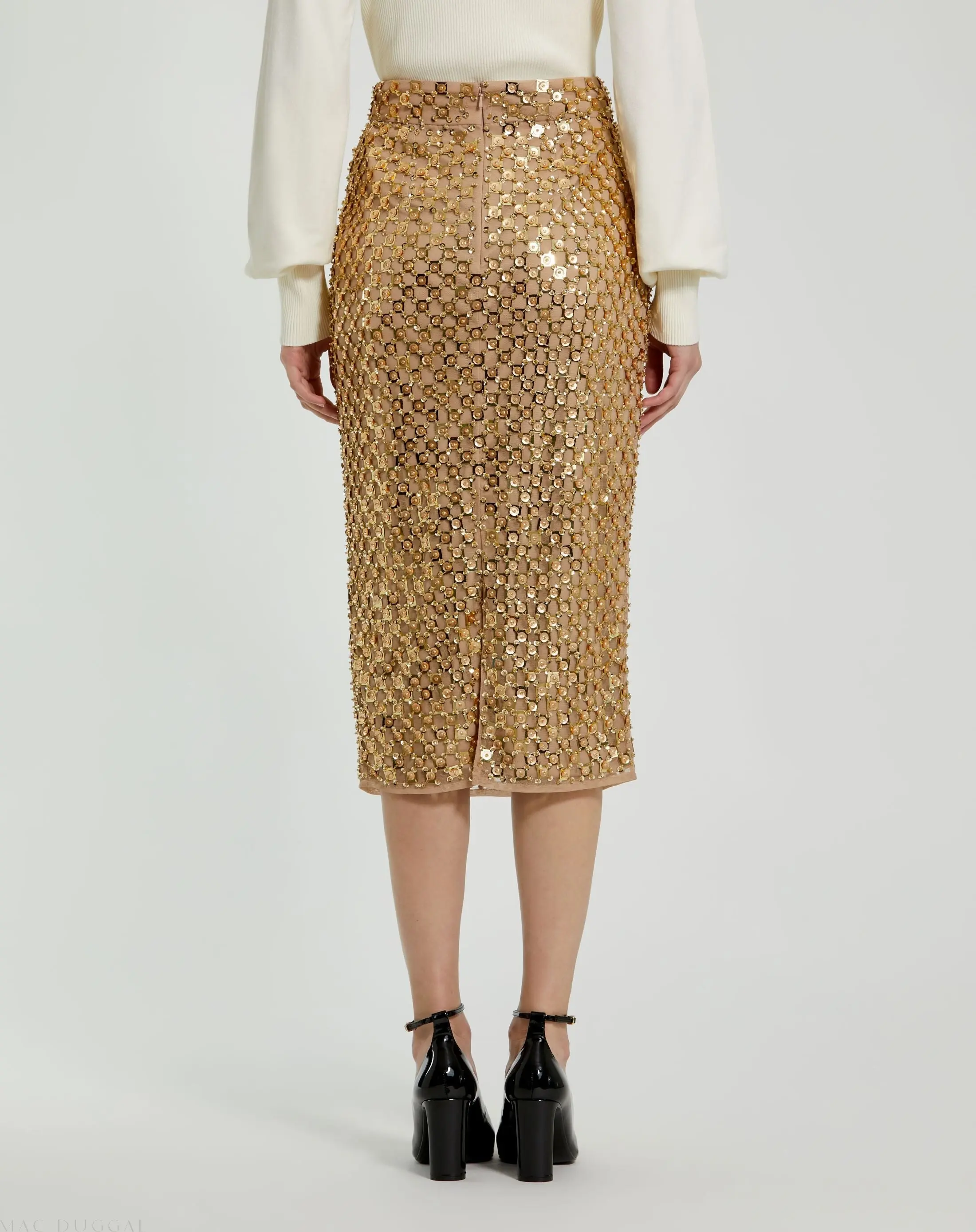 Shine in style with our Sequin Embellished Mesh Fitted Midi Pencil Skirt. This glamorous skirt features intricate sequin embellishments on a sleek mesh fabric, with a fitted pencil silhouette that flatters your figure. Perfect for special occasions, it offers a sophisticated and dazzling look.